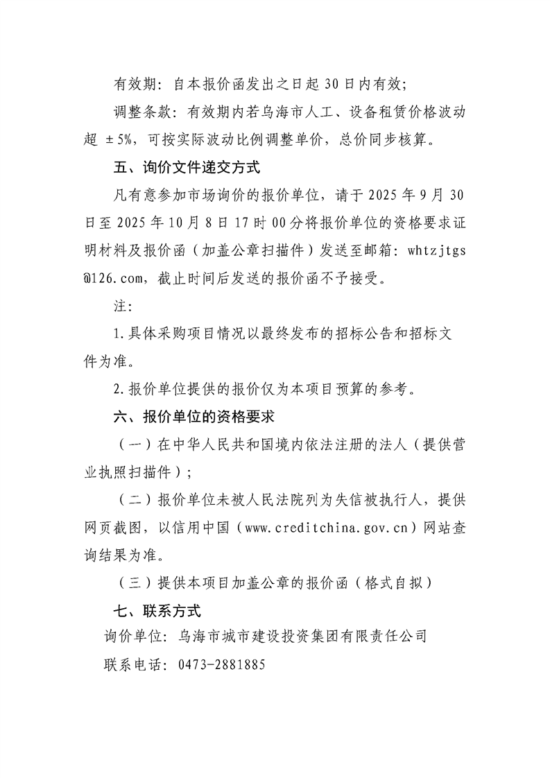 - 2025-07-17烏海市濱河城市運營服務(wù)有限責(zé)任公司電梯維保服務(wù)商采購詢價文件