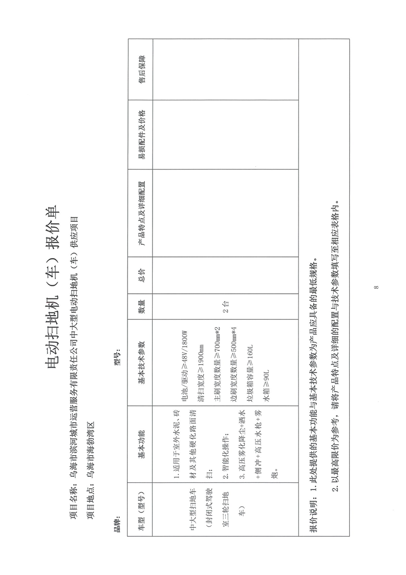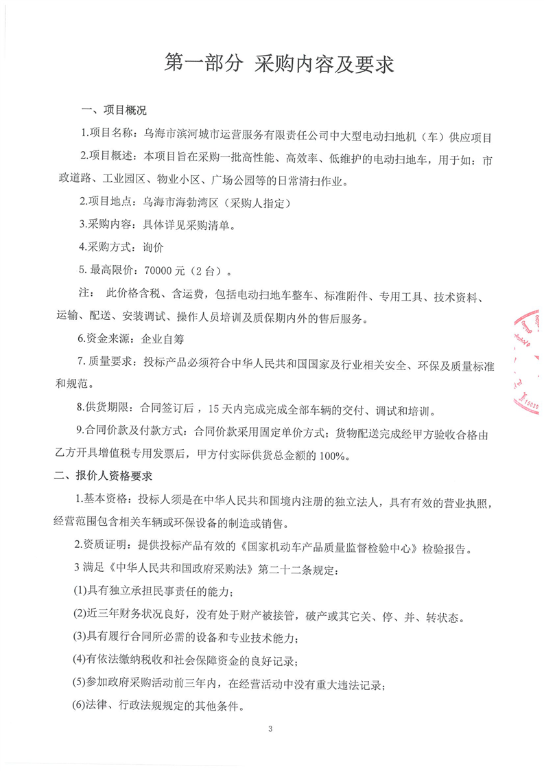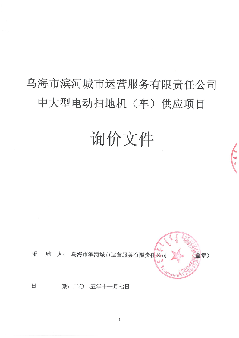 烏海市濱河城市運(yùn)營服務(wù)有限責(zé)任公司中大型電動(dòng)掃地機(jī)(車)供應(yīng)項(xiàng)目詢價(jià)文件